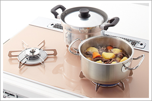- 高温炒めガスならではの炙り調理や炎をいかした高温炒め、圧力鍋の調理など、約290℃の高温調理が可能。強い火力を用いた本格調理が楽しめます。