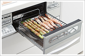 - 無水両面焼グリル遠赤外線と対流熱で上下から加熱。水を入れたり、食材を裏返す手間もなく、スピーディーに焼き上げます。