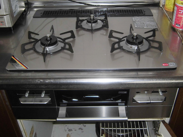 リンナイverieシリーズにお取替え頂きました!verieの特長は「ヒートオフ」機能で天板が汚れても焦げ付きにくく、お手入れがとてもカンタン!サッとひと拭きでお掃除が終わります。その他グリルの「スモークオフ」機能は従来のものと比べ、煙が81%カット、ニオイも99%以上カットされるというすごい機能が搭載されてます!煙とニオイで敬遠しがちな焼き魚等もどんどん焼けそうですね。見た目もキレイで他にもオススメの機能満載のコンロです。