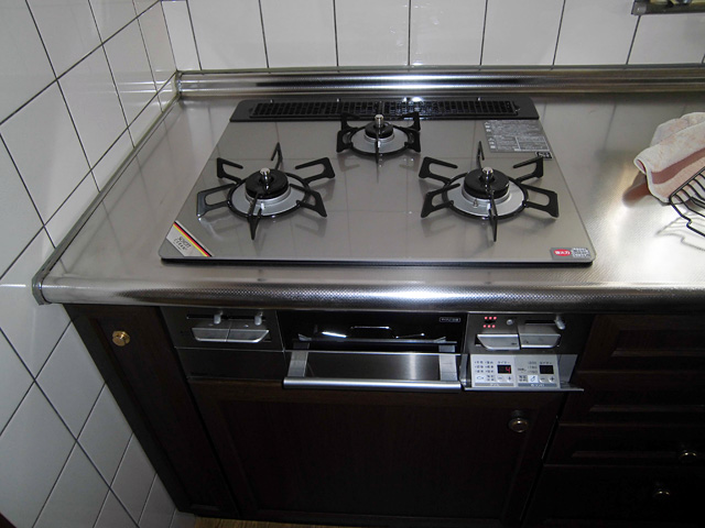 コンロはリンナイのverieシリーズにお取替え頂きました。コンロの操作部が開いてるのが写真でわかると思いますが、とても見やすくわかりやすい操作パネルになってます。この操作パネルではタイマーや温度、各調理モードの設定ができます。グリルの調理も操作パネルで行えます。お料理を楽しめる機能が満載のverieシリーズは工事費込で10万円台~です。(※パールクリスタル天板は9万円台~です)