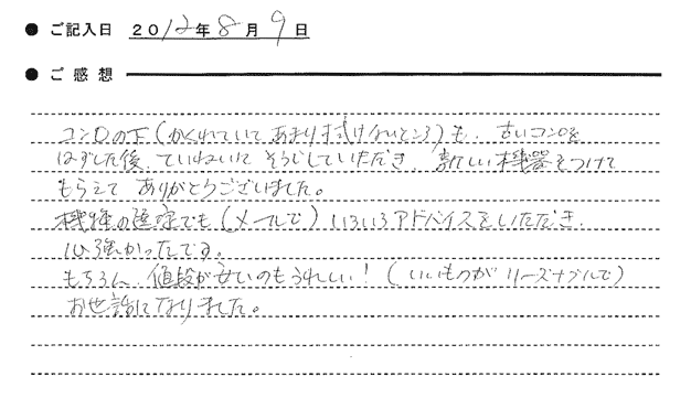 コンロの下(隠れていてあまり拭けないところ)も、古いコンロをはずした後、ていねいに掃除していただき、新しい機器をつけてもらえてありがとうございました。